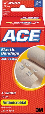 ACE™ Elastic bandage with E-Z clips measuring 4" x 1.8 yds is ideal for various body parts and injuries while being designed to provide support and compression.