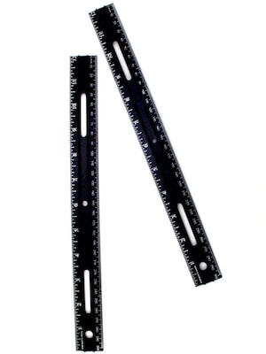 Quick reading graduations on our 12 in. recycled plastic ruler! Double bevel features pencil grooves and holes for easy insertion into 3-ring binders. Standard and metric measurements, black.