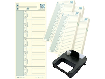 The Authentic Acroprint time card with a ribbon is designed for easy timekeeping with your ES700/ES900 time clocks. This essential accessory bundle includes 200 one-sided time cards and one durable ES clock ribbon. The high-quality time card captures four punches per day and allows for convenient reordering through QR code scanning. The long-lasting ES clock ribbon consistently prints clear punches and easily snaps into place for a quick replacement. Buy in bulk and save with this essential ES700/ES900 accessory bundle that provides everything you need to streamline your timekeeping management.