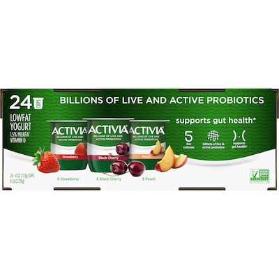 A 24 count pack of Activia Probiotic Lowfat Yogurt Variety Pack in 4oz cups. Variety pack includes 8 cups each of black cherry, peach and strawberry. With only 60 calories per serving and no added sugar this is a sweet and healthy yogurt choice. Activia probiotic yogurt is a great aid to regulating your digestive system to reduce bloating, inflammation or feeling uncomfortable. Bring a cup to work for a quick breakfast, pair with your favorite granola or pack in the kid’s lunches for a nutritious and delicious snacking option.