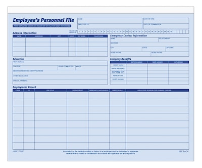 Record basic employee information with these personnel file folders. Each folder is preprinted with areas for education, company benefits and other details, while the heavy card stock material helps prevent rips and tears, so it stands up well to everyday wear and tear. These Adams personnel file folders come in a pack of 20, so there's plenty for everyone in the department.