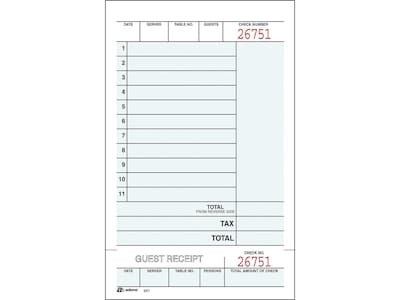 Take orders with these guest checks. Consecutive numbering on the top and on the stub makes staying organized simple, while the back of part two is ideal for jotting down beverage requests. These Adams guest checks come with 250 sets per package and feature two parts; the second part comes with a perforated edge, making it easy to remove and hand to customers.