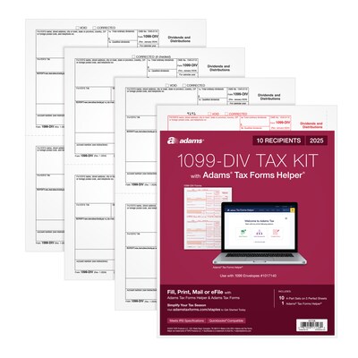 - 2025 1099-DIV kit includes 10 4-part 1099-DIVs and access to Adams Tax Forms Helper