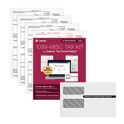 - 2025 1099-MISC kit includes 12 4-part 1099-MISC forms, 12 self-seal envelopes, 3 1096 forms and access to Adams Tax Forms Helper