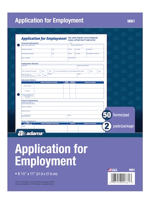 Make applying for employment simple by using these letter-size employment application forms. Each one is printed in English for convenience, while the three-hole-punched edge lets you conveniently insert them into any standard three-ring binder. These Adams employment application forms comply with all legal requirements and have 50 sheets per pad, so stocking up is easy.