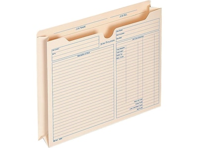 Organize work orders, invoices and other project information with these expanding job folders. Three-sided closures keep paper secure inside, while the thumb-cut fronts offer easy access to the documents stored inside. Each jacket features a preprinted form with inputs for job names, materials, labor costs and other important details. With 2-inch expansions, these Adams manila job folders hold thick stacks of paperwork.