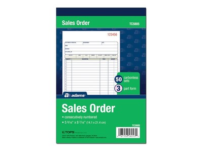 Adams 3-Part Carbonless Sales Orders, 8.44"L x 5.56"W, 50 Sets/Book (TC5805)