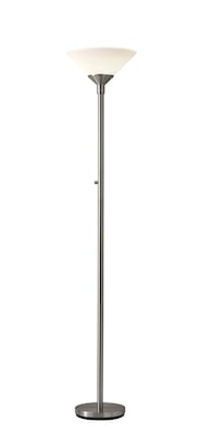 The Adesso Aries Floor Lamp provides efficient ambient lighting for an entire room in a slim design. Simplicity shines in this look with a brushed steel finish and a tapered frosted plastic shade. An Adesso patented 300W Double Socket construction allows for two crisscrossed sockets, each holding on/off 150W incandescent or LED bulbs which provides approximately 3 times more light than a typical torchiere. A simple high/low rotary switch is located on the pole to adjust the brightness. This lamp has a black cord and is smart outlet compatible. The three-way switch adjusts the light from low setting, high setting to off position.