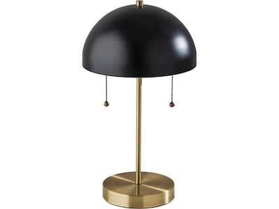 The 18" Adesso Bowie table lamp shines a light on vintage-inspired design in a mix of antique brass and black finishes. With its geometric symmetry and art deco flair, it is the perfect statement piece for desks, side tables, or nightstands. It features a sleek metal dome shade in a black finish that curves like a canopy over the lamp's slender pedestal and round base, both featuring an antique brass finish. For convenient access to power right from your desk or table, the 6.5"Dia. base features an AC outlet. Whether the lamp is turned on or off, the AC outlet will keep working normally. Operated by dual pull chains in an antique brass finish to easily turn it on or off, the lamp powers two 40W bulbs (not included) and features a 5' clear cord. The Bowie table lamp is also available with a black, pale blue, or pale pink finish on the shade.