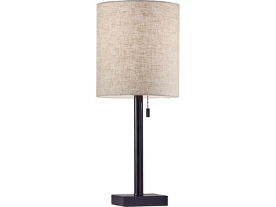 The Adesso Liam table lamp features an elegant design that highlights simple materials and a classic silhouette. A thick antique bronze metal pole supports a textured fabric shade in natural beige color. A tall cylinder shade is contrasted by a compact square shaped metal base. A simple pull chain turns the lamp on and off. Set this table lamp on your nightstand for a soft transitional look.