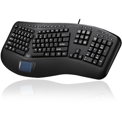 The Adesso Ergonomic Touchpad Keyboard offers you an advanced input device with ergonomic design, and multifunctional features. The design of this keyboard with split key zones and gently sloped encourages natural position of hands, wrists, and forearm in maximum comfort for long use. The keyboard also features an integrated touchpad which can take the place of your mouse, making it easier to control the movement of the cursor on your personal computer.