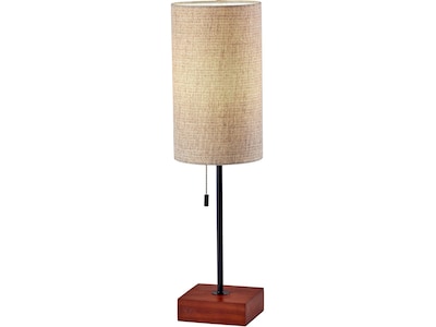 Illuminate your space in a stylish blend of neutral colors with this Adesso Trudy table lamp. This modern lamp artfully mixes materials and shapes, with a cube-shaped base in a warm walnut finish, thin black stem, and a tall drum-shaped shade. The natural color (beige and brown) textured fabric shade softly distills light from a 60W bulb (not included). Operated by a pull-chain switch that matches the stem, this table lamp also comes with a 5' brown cord.
