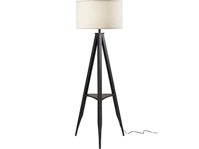 Defined by simplicity and clean lines, the 61.5" Adesso Warren floor lamp with shelf adds multifunctional style to your space. It features a black metal tripod frame with tapered legs and an open 14" triangular metal shelf in a matching black finish. With a clearance of 20", the shelf provides convenient storage and display of your favorite accent pieces, making the lamp a perfect choice for placement by couches or in room corners for illumination and functional style. Topping the metal frame is a large off-white linen drum shade that softly diffuses the light from the 150W bulb (not included) for a warm glow. Operated by a three-way rotary socket switch to easily change the lighting level between high, medium, low, and off, the floor lamp also features a 6' black cord.