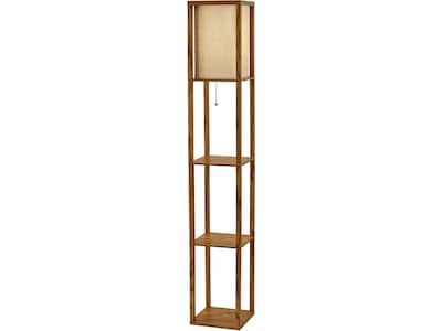Have it all with style and multifunctionality. The Adesso Wright shelf floor lamp features a walnut wood veneer finished open box frame with two additional display/storage shelves, making it a handy addition to a living/media room, den, office, or bedroom. The square textured fabric shade in natural color diffuses light from a 150W incandescent or equivalent bulb. The lamp offers on/off functionality with a metal ball accented pull-chain switch, comes with a clear cord, and is smart outlet compatible. Includes clear wire clips for a clean look.