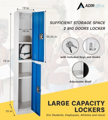 This 72" 2-tier steel locker provides secure, space-efficient storage with two separate compartments. Featuring lockable ventilated doors, adjustable shelving, and internal hooks, it’s ideal for schools, gyms, homes, or workplaces.