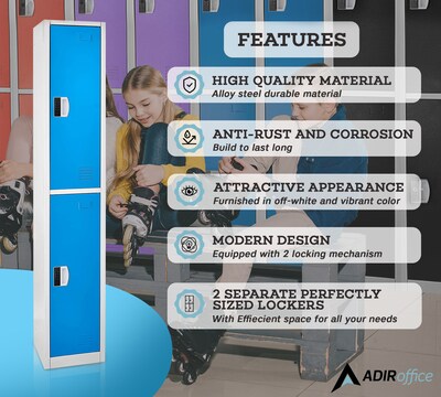 The AdirOffice Steel Double Compartment Tier digital lock Storage Locker will also be warmly welcomed in school corridors, golf clubs, sports franchises, public safety, first responder and similar organizations where secure storage for participants is essential. AdirOffice storage lockers keep clutter off the floor and secure items within. The storage locker includes 2-shelved compartments and 2-hooks to store items. This is a dual tier compartment storage locker with vents for air flow. Assembly required with provided hardware. Each locker door can be locked with included digital lock, providing the highest level of security for your peace of mind. Transform any locker into a fortress of security with a passcode of your choice, customizable up to 15 characters in length. Easy install of digital lock with provided instructions. The AdirOffice locker also contains a slot for names or numbers for personal or public use extends locker utility.