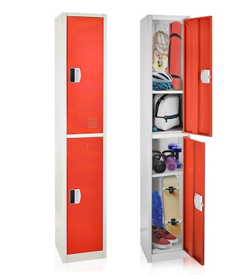 The AdirOffice Steel Double Compartment Tier digital lock Storage Locker will also be warmly welcomed in school corridors, golf clubs, sports franchises, public safety, first responder and similar organizations where secure storage for participants is essential. AdirOffice storage lockers keep clutter off the floor and secure items within. The storage locker includes 2-shelved compartments and 2-hooks to store items. This is a dual tier compartment storage locker with vents for air flow. Assembly required with provided hardware. Each locker door can be locked with included digital lock, providing the highest level of security for your peace of mind. Transform any locker into a fortress of security with a passcode of your choice, customizable up to 15 characters in length. Easy install of digital lock with provided instructions. The AdirOffice locker also contains a slot for names or numbers for personal or public use extends locker utility.