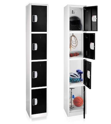 The AdirOffice Steel Four Compartment Tier digital lock Storage Locker will also be warmly welcomed in school corridors, golf clubs, sports franchises, public safety, first responder and similar organizations where secure storage for participants is essential. AdirOffice storage lockers keep clutter off the floor and secure items within. The storage locker includes 4-shelved compartments and 4-hooks to store items. This is a 4 tier compartment storage locker with vents for air flow. Assembly required with provided hardware. Each locker door can be locked with included digital lock, providing the highest level of security for your peace of mind. Transform any locker into a fortress of security with a passcode of your choice, customizable up to 15 characters in length. Easy install of digital lock with provided instructions. The AdirOffice locker also contains a slot for names or numbers for personal or public use extends locker utility.