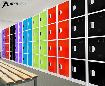 - Sides of the locker are furnished in a neutral off-white color, accented by vibrant door color