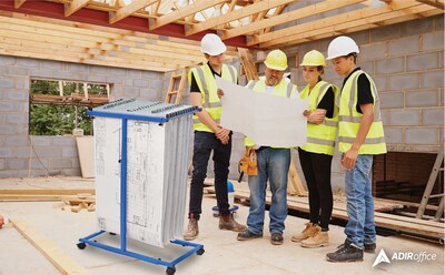An ingenious solution to the difficulties of moving documents. This AdirOffice solid steel mobile plan center works equally well in harsh environments, such as construction sites, and soft settings, such as modern offices. It glides easily across spaces on its four swivel casters, two of which brake for control of movement. Simply drop the files in and lift them out, as needed. The width is adjustable to fit 24", 30" and 36" hanging clamps (sold separately), and it can hold up to 12 clamps. Durable, convenient, and simple to set up.