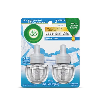 Eliminate odors and keep bathrooms, hallways, breakrooms, and other areas smelling as fresh and clean as laundry with the Air Wick Snuggle Fresh Linen scent. Air Wick scented oils contain natural essential oils that can easily infuse multiple rooms. Each 0.67-ounce scented oil refill delivers up to 45 days of continuous fragrance.