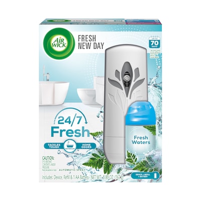 Air Wick® Automatic Spray fills your home with the fresh fragrances you love and help neutralize odors. Designed for 24/7 odor neutralization for up to 70 days on low setting. Starter kit includes dispenser, refill, and 1 AA battery.