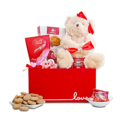 - Includes: Pink Strawberry Frose Mix (1oz.), Jack Allen Chocolate Chip Cookies (2oz.), Pirouline Chocolate Hazelnut Wafer Rolls (3.25oz.), Russell Stover Strawberry Crème Milk Chocolate Truffle (0.7oz.), Ghirardelli Milk Chocolate Caramel Duet Hearts (0.7oz.), Truffettes de France Cocoa Dusted Truffles (1.2oz.), Lindt Lindor Milk Chocolate Truffles (2pcs.), Bellagio Chocolate Truffle Hot Cocoa (1oz.), Tom Clark's Caramel Popcorn (3oz.), Snickerdoodle Cookies (2.5oz.), Plush Teddy Bear