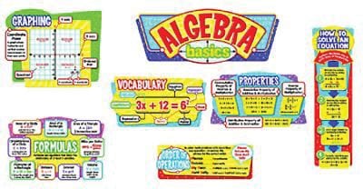 Trend Enterprises® Bulletin board set with algebra basics theme consists of key algebra concepts with colorful examples and clear definitions. Set of 7 pieces is ideal for grades PreK - 3 and can be used up to 25".