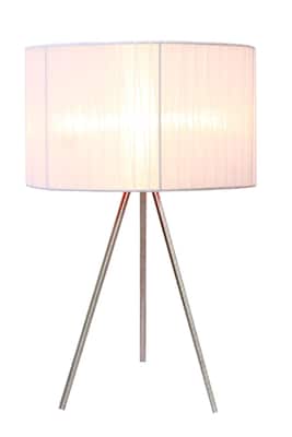 Simple Designs White sheer silk band triPod table lamp with brushed nickel finish is made of traditional style metal. Lamp with 5' cord length is perfect to use in living room, bedroom or office.