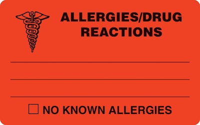 - 100 Fluorescent Red "Allergies/Drug Reactions" labels per package
