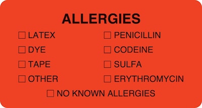 Brightly colored labels signal important patient information to your staff 500 Fluorescent Red "Allergies" labels per package