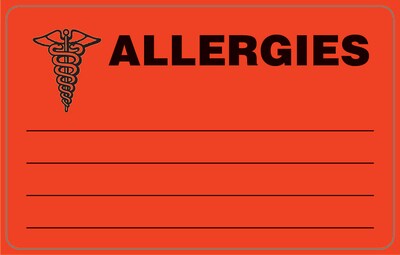 Allergy warning labels help improve patient care and serve as an alert to all staff, informing them of vital patient information. 100 Fluorescent Red "Allergies" labels per package. Pressure-sensitive for easy application. Size: 4" x 2-1/2".