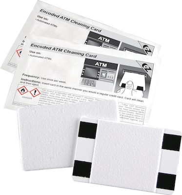 The Encoded ATM Cleaning Card is designed to clean magnetic heads, card pathways, transport belts and guide rollers in automated insertion ATMs. 10 Cards per box.