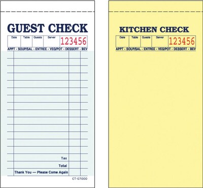G7000 Guest check measures 3.4" x 6.73" and comes in Green with blue lines/yellow unlined. Checks are made of carbonless paper for durability and come sequentialy numbered to help waiters and cook staff. Check headers have spaces for table number, date, customer count and table server identification.