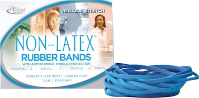 Made from a synthetic rubber compound, these elastic bands prevent latex allergy reactions. The antimicrobial product additive inhibits the growth of fungi, molds and bacteria that can cause early product deterioration. The antimicrobial treatment permeates the rubber band, protecting it on all surfaces for its lifetime. This product does not protect users from food borne or disease causing microorganisms. Not for use on direct food contact. When creating a latex-free environment is important for the health and safety of others, Alliance Rubber Company's Non-Latex Rubber Bands with Antimicrobial Product Protection are a great choice.