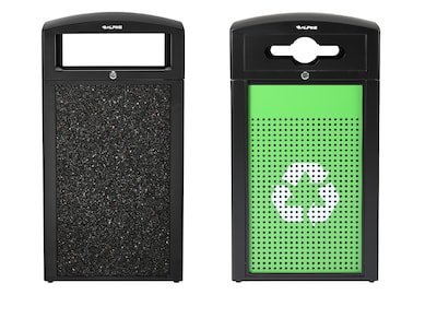 - 40-gallon grey stone panel trash can and green steel panel recycling combo station for a total of 80-gallons