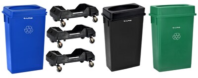 - Black, blue, and green waste receptacles, each with same colored drop fold swing shaped lid, and 3 trash can dollies