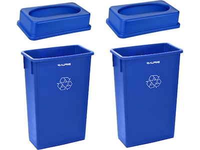 The Alpine 23 gal. blue indoor trash container is stylish and compact, making it easy to fit into any office or commercial space. This recycling trash can features a large and clear print label, making it a noticeable trash disposal solution even from far away. The trash can is designed with anti-jam reinforcements and a swing lid for easy disposal of trash. Great recycling or wastebasket for small- to medium-size traffic areas in the home or office.