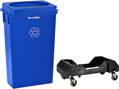 The Alpine Industries 23-gallon slim recycling bin with lid and dolly delivers a space-saving, touch-free recycling solution for indoor commercial environments. Designed for small to medium traffic areas, this durable polypropylene bin includes a drop-slot lid and a heavy-duty dolly for easy transport.