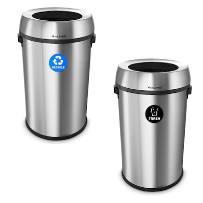 Alpine Industries Stainless Steel Recycling Bin and Trash Can with Open Lid, 34 Gallon, Silver, 2/Pack (ALP470-65L-R-T)