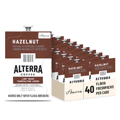 The Alterra Hazelnut coffee is an arabica light roast blend with smooth and nutty aromatic notes. Made for your Flavia brewer, this freshpack produces drip coffee and contains natural and artificial flavors.