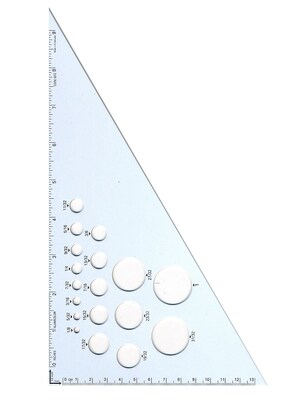 Alumicolor's Calibrated Triangles are made of tempered aluminum. Photo anodized calibrations are part of the finish and resist cleaning or rubbing off. Ultra smooth finish won't mark your work surface.Available in 45/90 or 30/60/90 angles. Calibrations are in inches and centimeters. Various circle holes are also cut in the triangle center and feature calibrations.