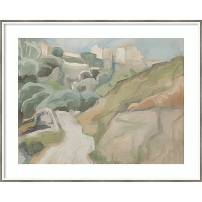 A soft pastoral landscape in sage and grass-green shades sits peacefully under a pale azure sky. Rolling hills cover the land bisected by a winding path calling the hiker upward.