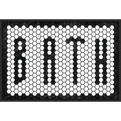 Dozens of little black hexagonal tiles work together to spell out the word Bath. Plain white tiles provide an angular contrast and fit nicely into the black tile edging.