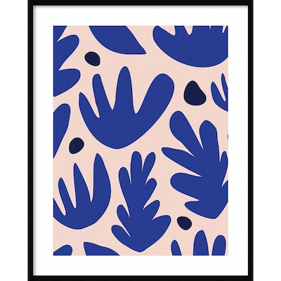 Shades of blue add a pop of color wherever you place this unique piece of art. Abstract flowers form a repetitive but asymmetrical pattern, each shape different from the next, contrasting with the light pink background.