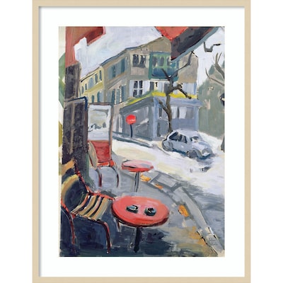 Amanti Art home decor products are made using traditional custom framing techniques that give you the quality you would expect from your local frame shop. A chair and table stand vacant, awaiting the next customer at a sideway cafe.