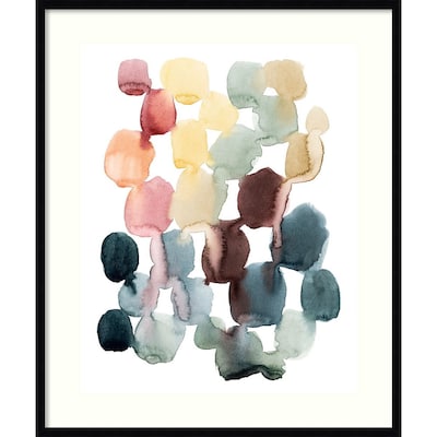 Shade, sunshine, sand, and sky; an array of colorful shapes blends peaceful tones of yellow, green, red, and blue for a sunset sonata or a series of blossoms. Watercolor droplets overflow their shapes to add movement and new color to the scene.