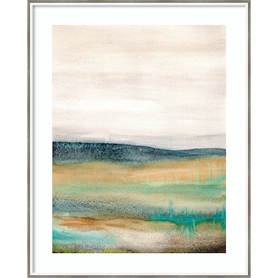 This painting showcases soft, layered gradients of earthy tones, transitioning from deep blues and greens at the bottom to a light, airy sky above. The abstract landscape evokes a serene, misty horizon.