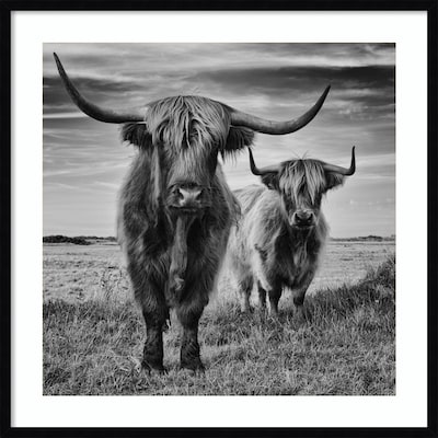 Living in the wilds as they do, these two longhorn cows have developed shaggy fringes that match well with the swishing grass and streaming clouds in this black and white photograph.