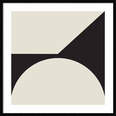 A minimalist abstract design featuring geometric shapes in black and beige. The composition includes a large semi-circle intersected by a triangle and rectangle, creating a visually striking and balanced pattern.